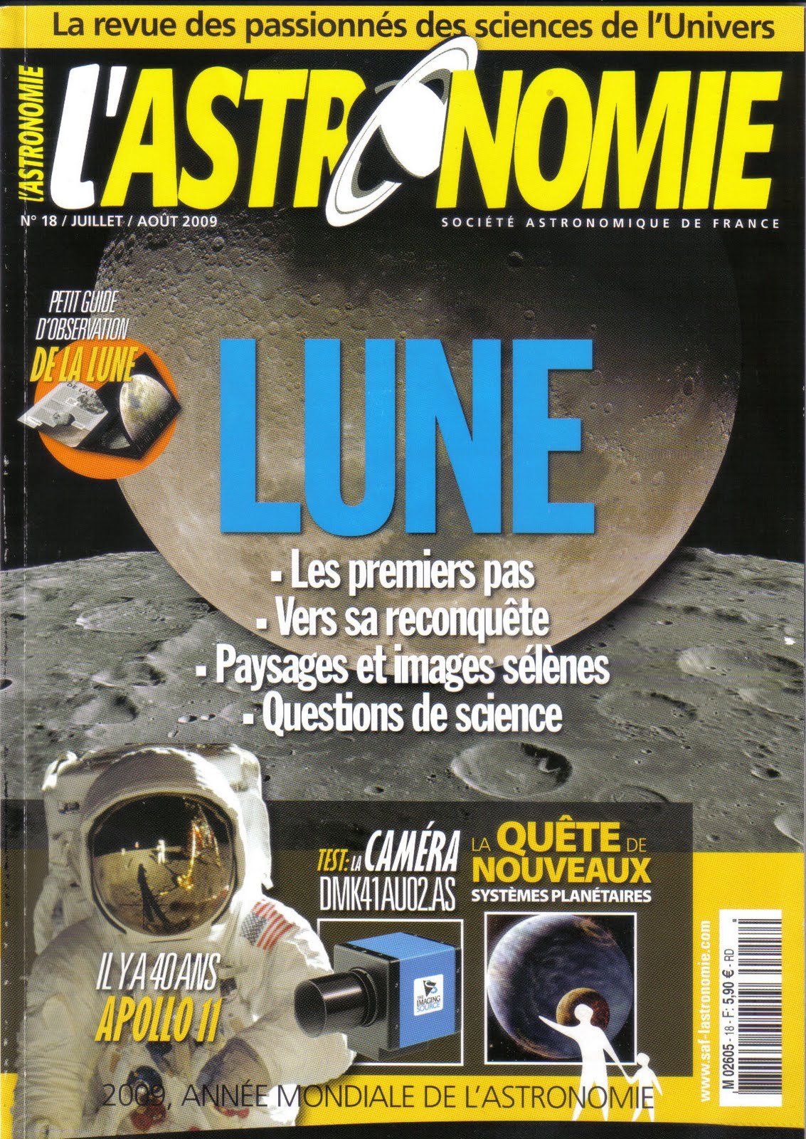 Pour les 40 ans d’Apollo 11, le magazine L’Astronomie consacrait son numéro de juillet à la Lune , proposant des extraits du livre d’Armstrong J’ai marché sur la Lune , une présentation des journaux qui couvrirent l’événement à l’époque, un commentaire d’Olivier de Goursac sur son livre de photos retravaillées, un article sur la sonde Kayuga et un autre sur le retour des grandes opérations lunaires avec LRO, LCROSS et les missions préparatoires aux vols habités.