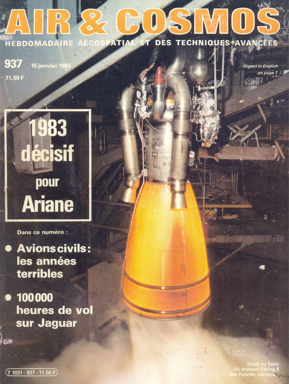 En couverture : Essai du nouveau moteur Viking 5 de la fusée Ariane 3 sur les bancs d'essai de la SEP à Vernon. Ce moteur à pression de combustion accrue et à divergent galbé développe une poussée de 66 tonnes. Photo SEP.